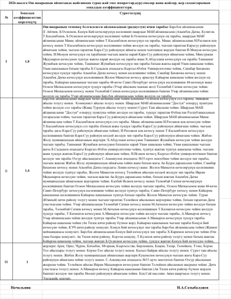 Ош шаарынын мэриясы Ош шаарында мүлк жана жер салыгы боюнча Кз зоналдык коэффициенттердин өлчөмүн жана нарктык зоналардын чектерин бекитүү жөнүндө маселени сиздердин карооңуздарга сунуштайт.